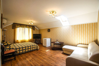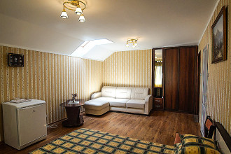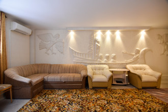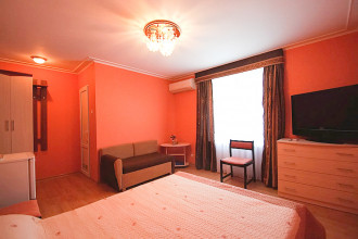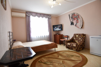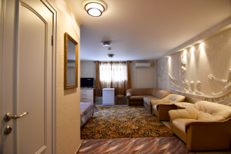 Мебель: двуспальная кровать, прикроватные тумбочки, мягкий уголок, два кресла,журнальный столик, платяной шкаф