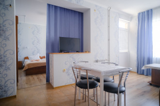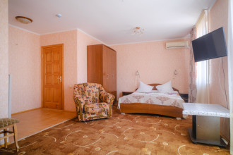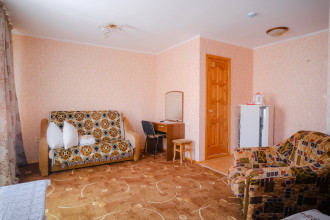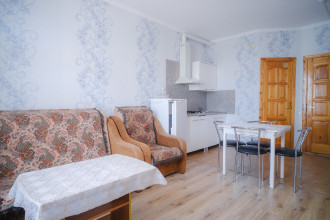 Мебель: одна двуспальная кровать, диван, кресло, журнальный столик, шкаф для одежды, мини-кухня