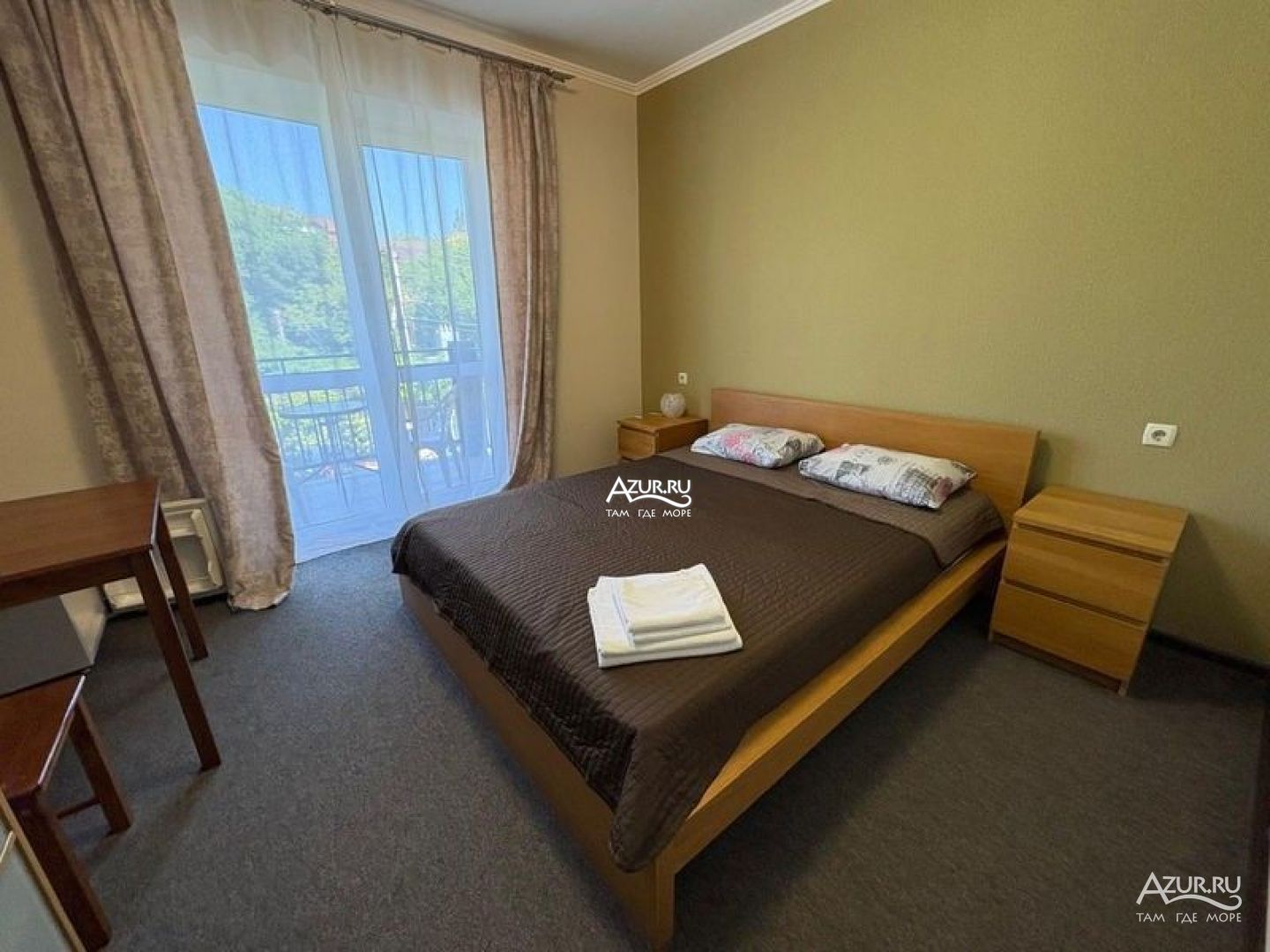 Мебель: двуспальная кровать, двухместный раскладной диван, прикроватные тумбочки, шкаф, стул, стол,балкон