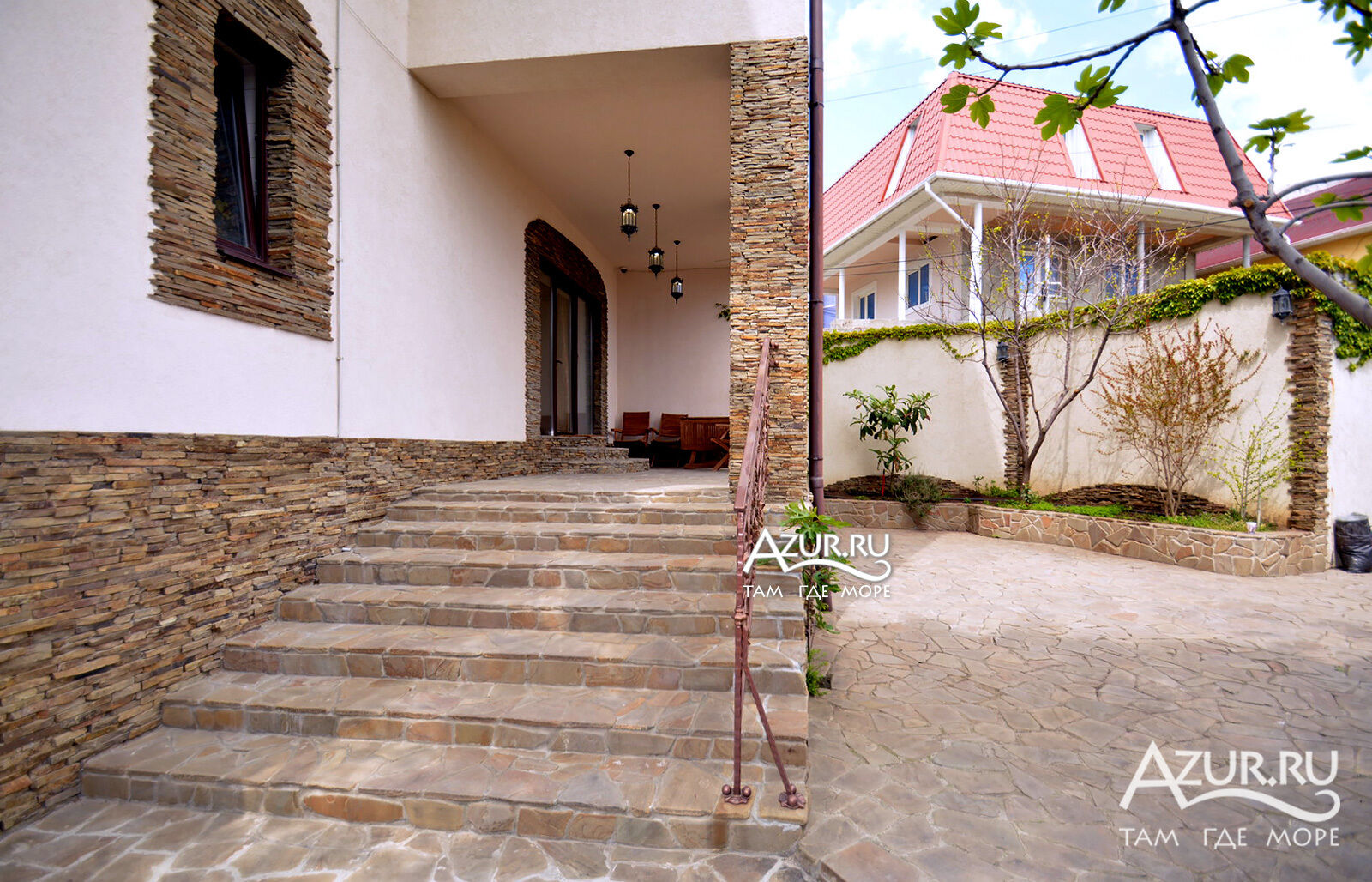 двор с двумя независимыми входами и въездами, местами по два авто, каменными столами и барбекю, террасами у независимых входов в дом со столами и стульями.