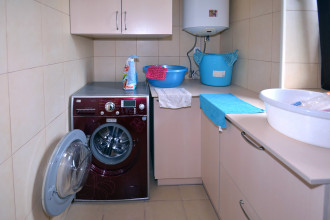 Первый этаж: гостиная, кухня-столовая, прачечная, санузел с душевой кабинкой, бытовка-кладовка.