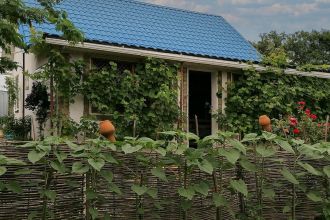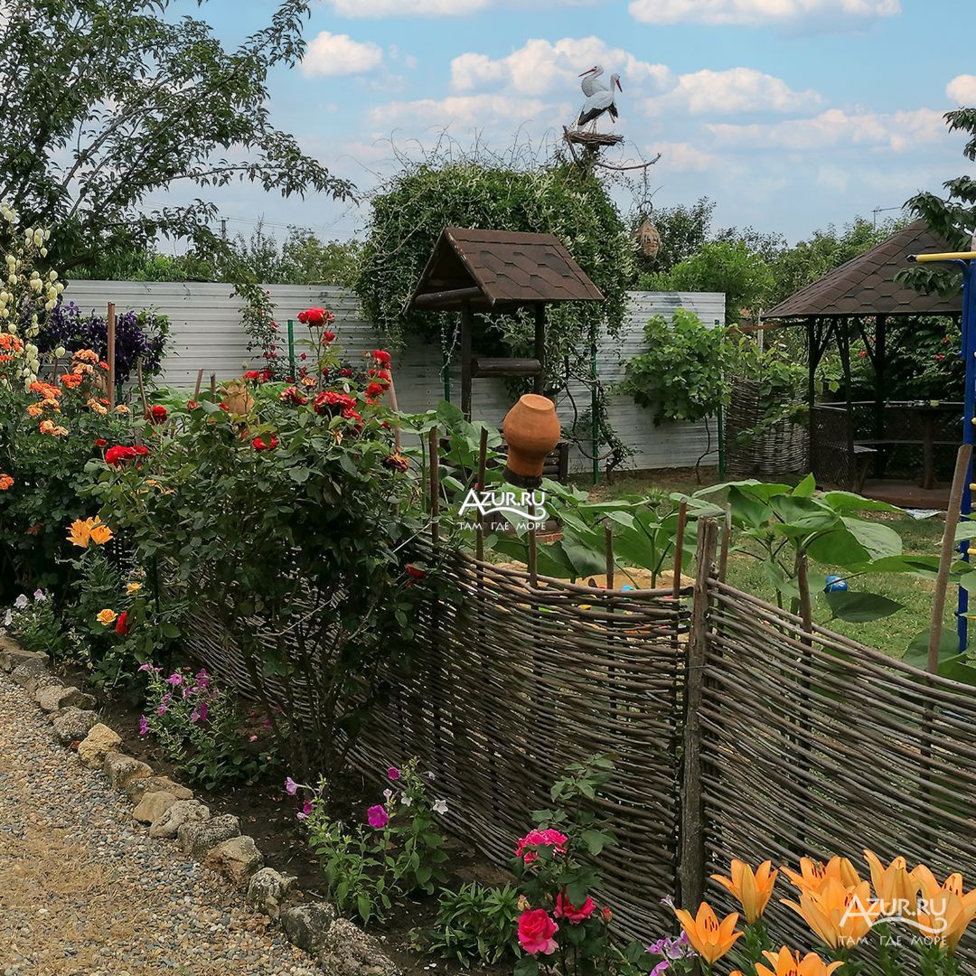 Закрытая территория площадью 1000 кв.м., оформленная в аутентичном стиле казачьего подворья, детально продумана и разделена на функциональные зоны с помощью плетней из натуральной лозы. На плетнях размещены традиционные глиняные горшки, известные как глэчики, что придаёт территории особый колорит и историческую аутентичность.