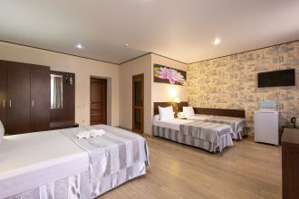 Ездили с детьми в конце сентября. Номер семейный с кухней. Отель не плохой если устранить все минусы, Номер большой вся мебель как на картинке, персонал доброжелательный и приветливый, но есть минусы. В номере очень грязно было при заезде, хотя нам сказали что была уборка. В последующие дни тоже была ежедневная уборка, но это сложно назвать уборкой, просто протерли пол влажной тряпкой, мусор весь остается на полу, приходилось самой все выметать. Сантехника сломана! Ужасный запах в ванной комнате. Отель выбирала из-за бассейна, так как был уже не сезон и море холодное. При бронировании уточняла несколько раз про обогрев бассейна, уверяли что обогреваемый, а по факту НЕТ, вода холодная, зашли в бассейн и вышли через минуту. Белые шторы с беседок, которые на картинках были убраны, впечатление испортилось. Скорее всего данный отель больше не выберу.