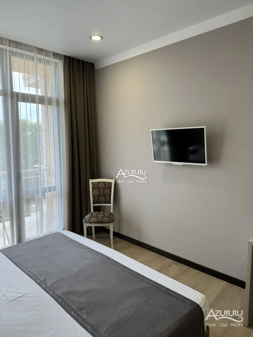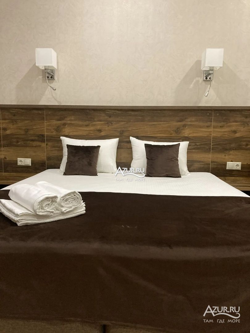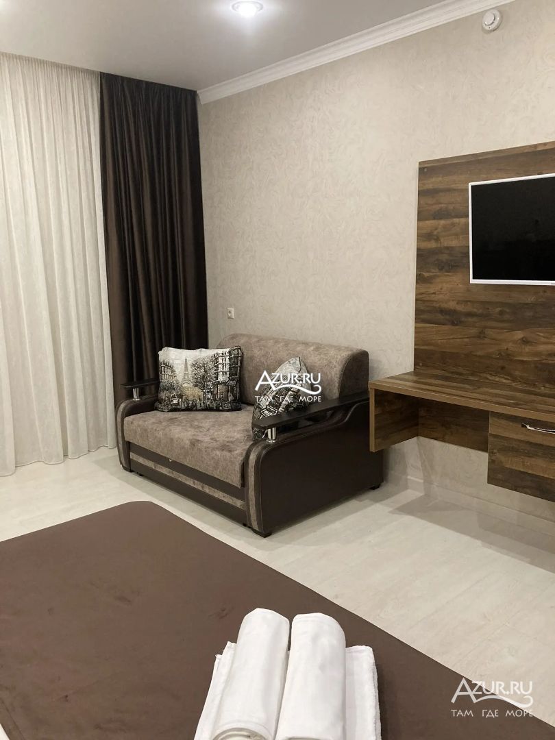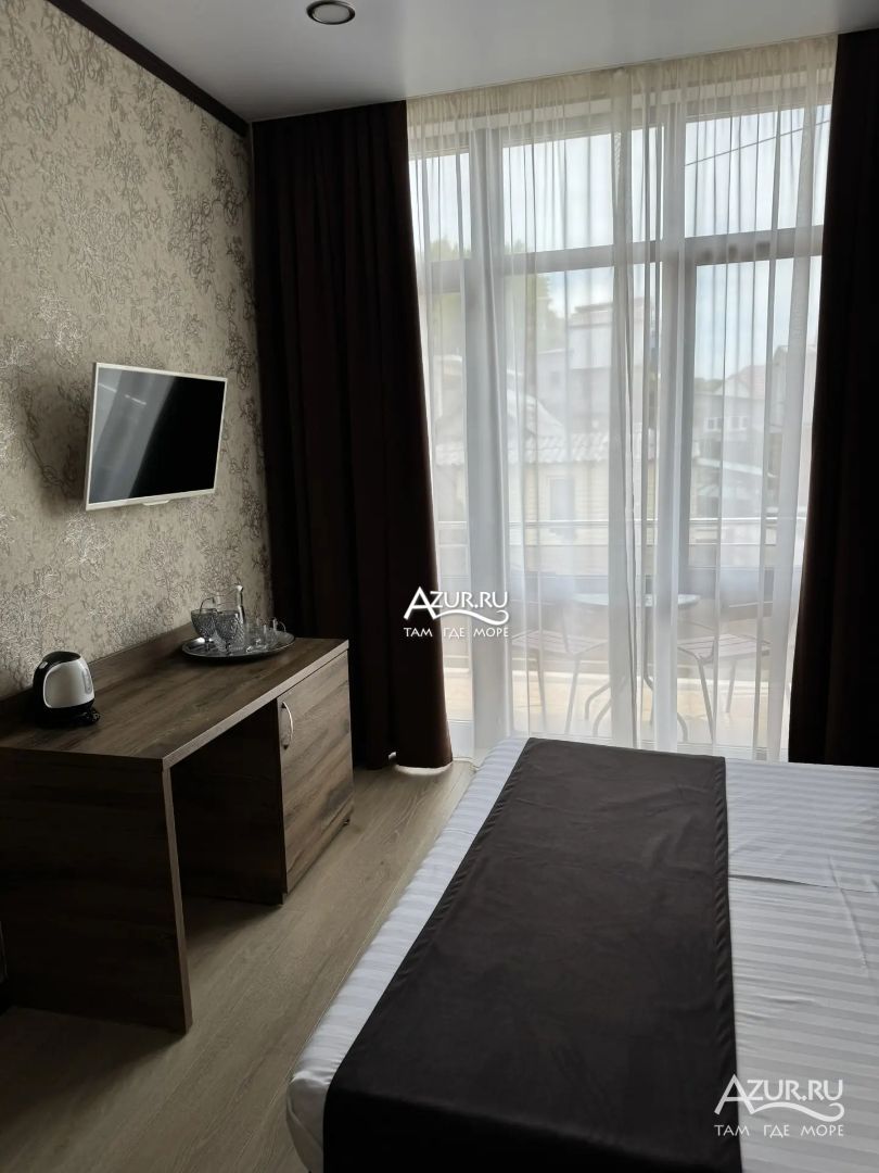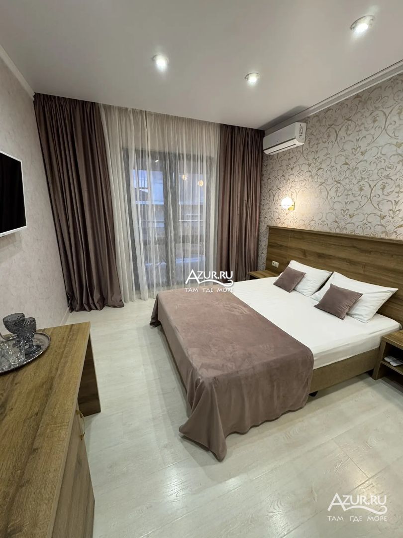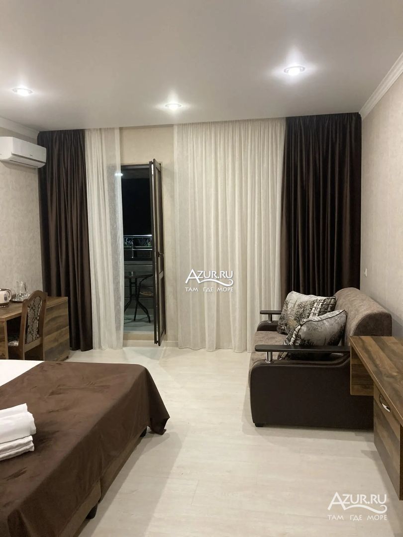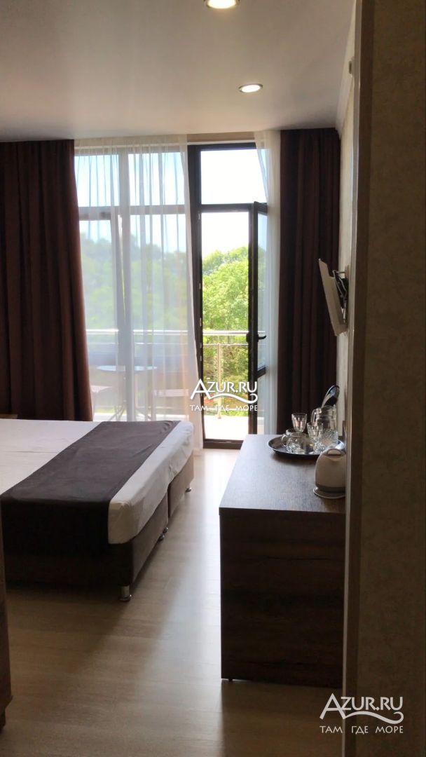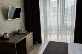 Замечательный отель. Все лучше, чем ожидали! Красивый, новый, современный, чистый, соответствует хорошему заграничному отелю. Видно сразу, всё сделано "со вкусом". Благоустроенная и ухоженная территория вокруг, просторная стоянка, цветочные клумбы, световое оформление. Номера отличные, все необходимое в номере: сплит-система, телевизор ЖК, хорошая кровать, удобные подушки, чистое бельё, белоснежные полотенца, бельевой шкаф, холодильник, сейф, стол, стул, графин со стаканами, индивидуальные гигиенические принадлежности (мыло, шампунь, гель для душа), удобные шторы блекаут. Санузел в номере. У нашего номера был балкон с видом на море, на балконе стол и 2 стула, сушилка для белья. Уборка номера раз в три дня, замена полотенец. На на третьем этаже, на котором мы жили, имеется мини-кухня, где можно разогреть еду в микроволновке, воспользоваться приборами, раковина. На втором этаже общая кухня, где можно приготовить еду самостоятельно, а так же стоит стол со стульями. До моря пешком 4-6 минут и сразу попадаешь на пляж Дельфин, пляж хороший , чистый, за отдельную плату предоставляются лежаки. Вокруг отеля много мест где можно покушать: кафе, шашлычные, столовые. Местность где располагается отель не шумная, относительно центра Лазаревского. Если хотите повеселиться, то вам на пляж, там есть кафе с вечерней шоу-программой. В общем из минусов отдыха то, что отпуск-это временно, и он заканчивается когда-то))