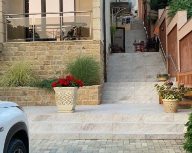 Территория уютная, имеются зоны отдыха, составляющие из столов стульев и лавочек, есть мангал. Присутствует приятная для глаз растительность. Так же на территории находятся парковочные места для машин.