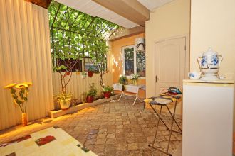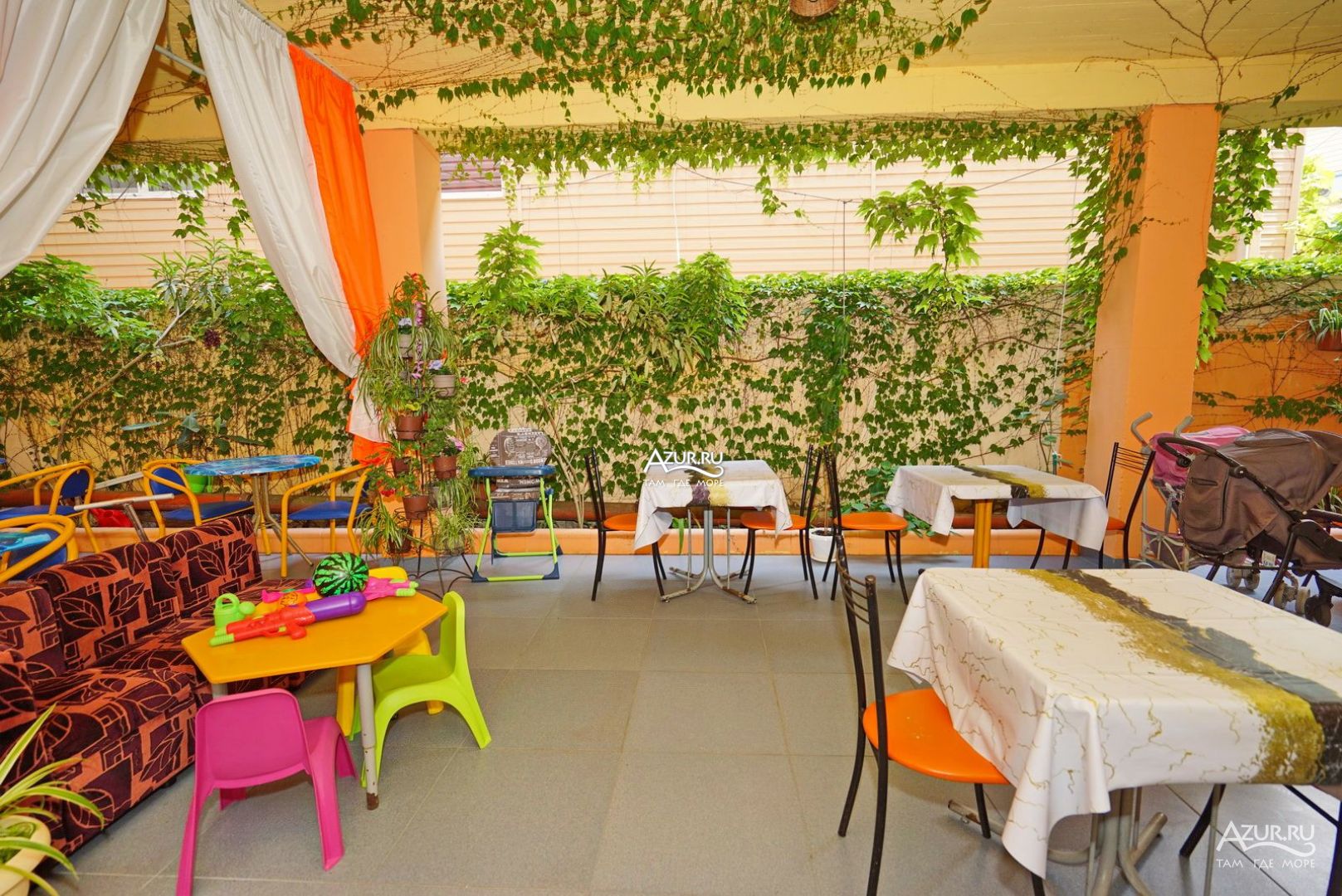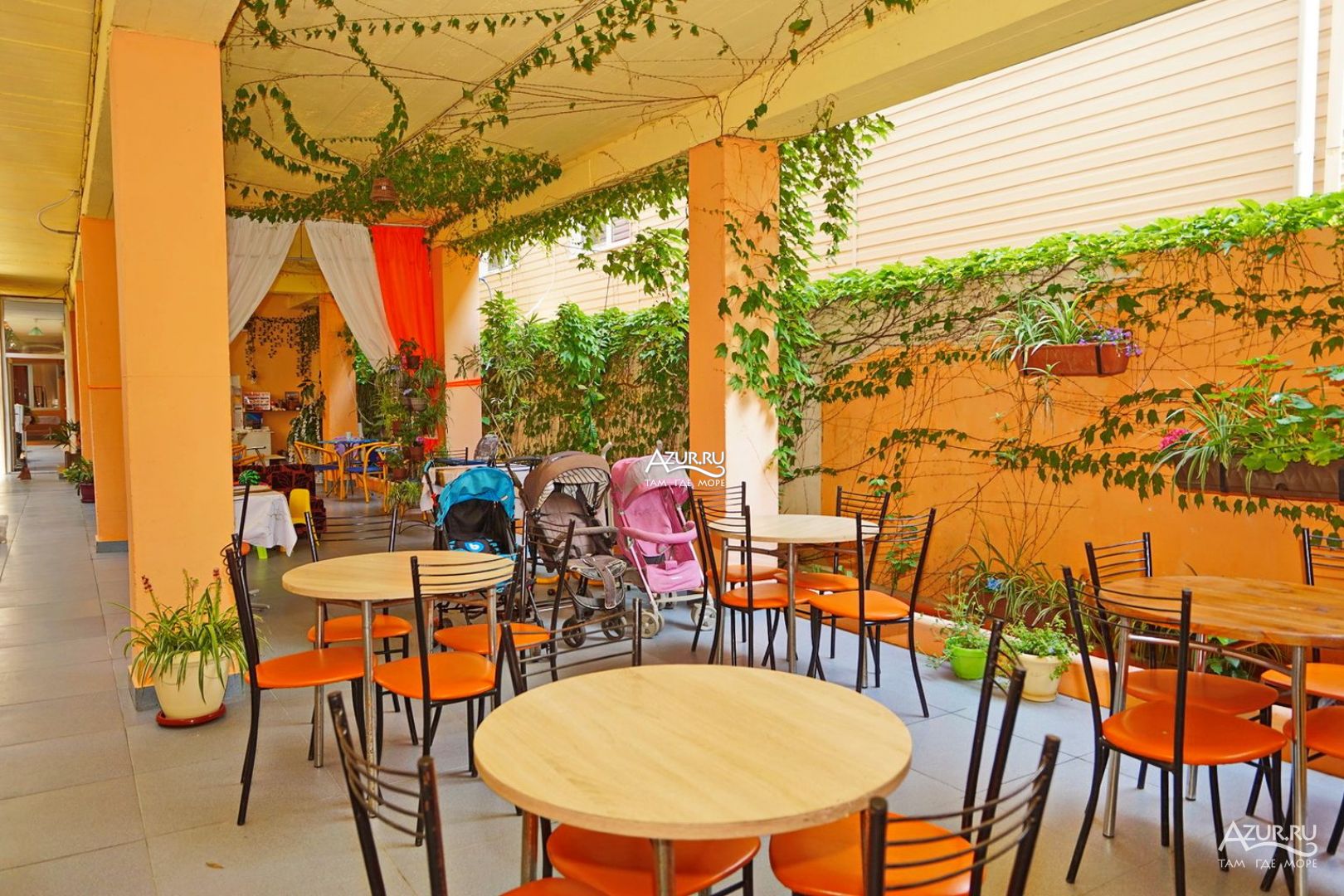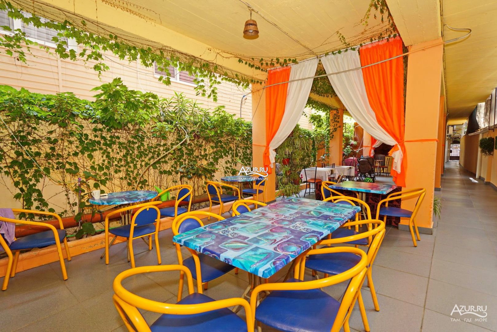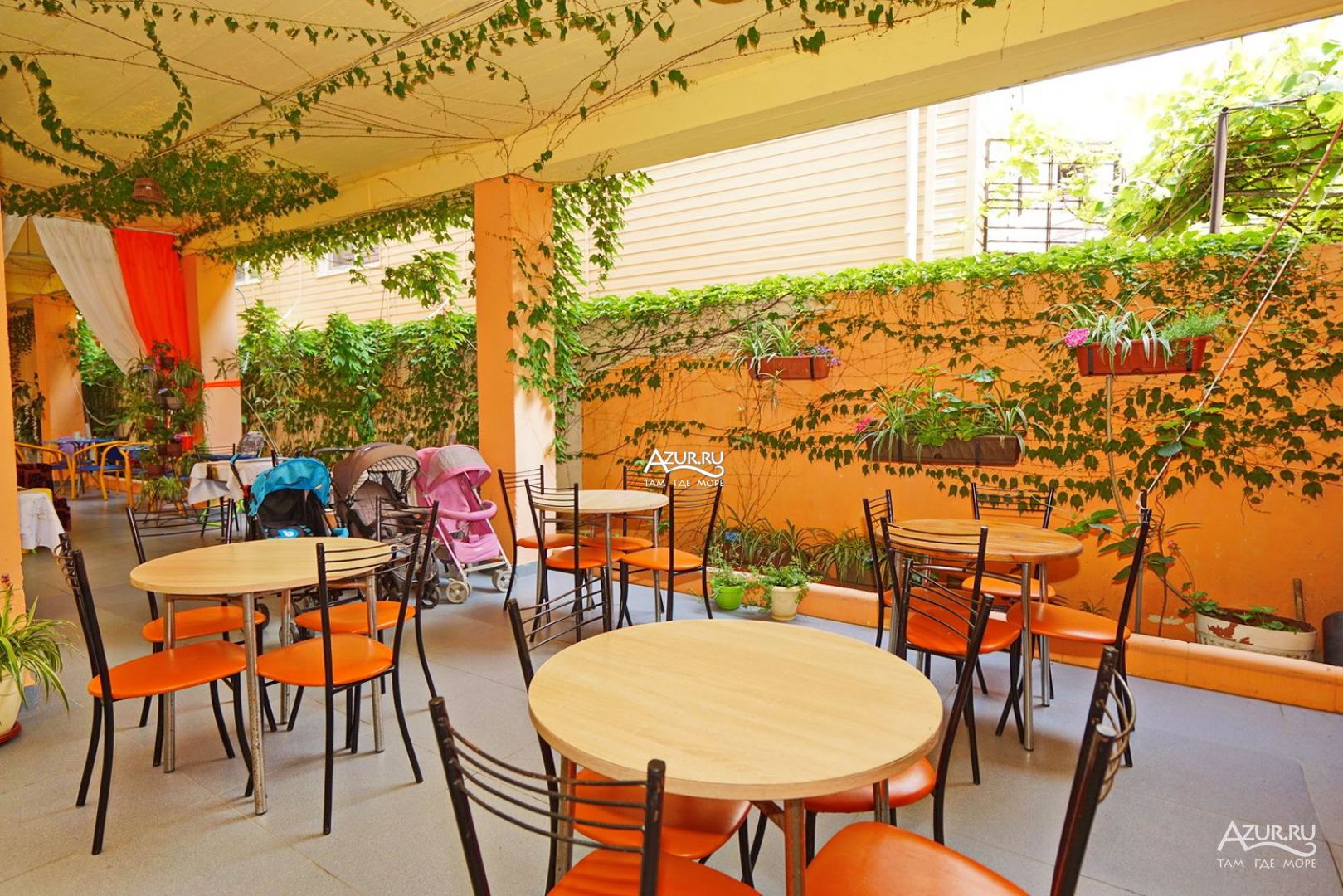 Во дворе очень зелено и всегда прохладно, стоят столики для посиделок, детский уголок, диванная зона, где можно пообедать или поужинать.