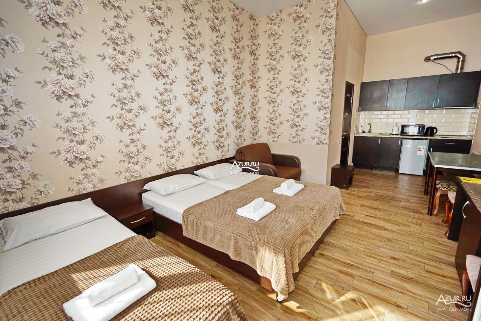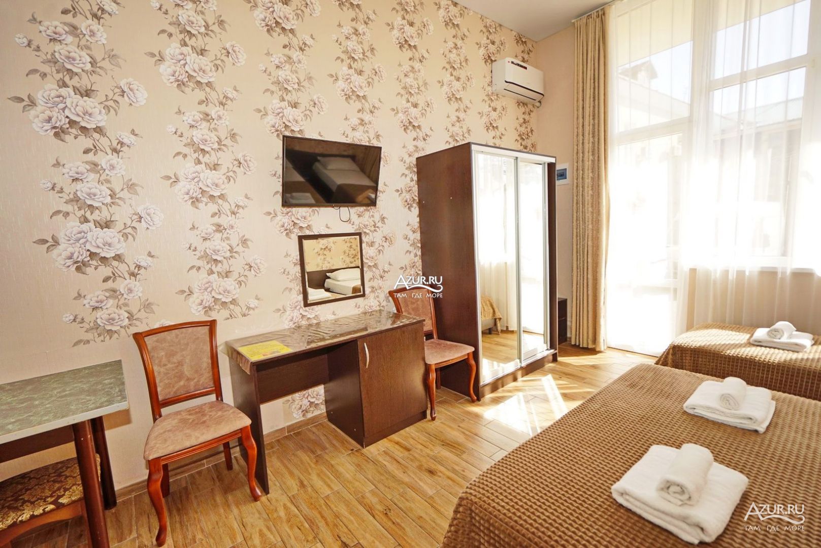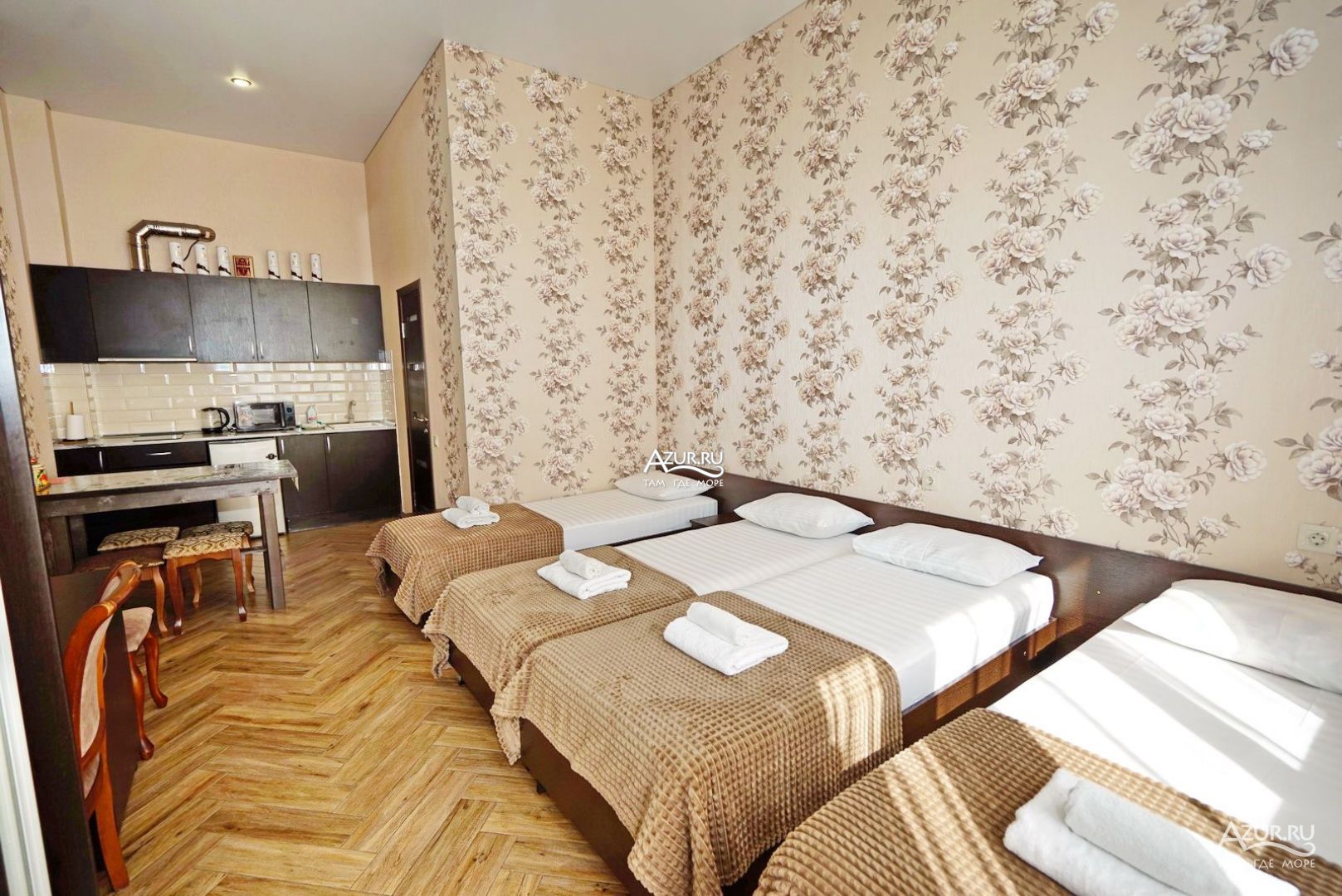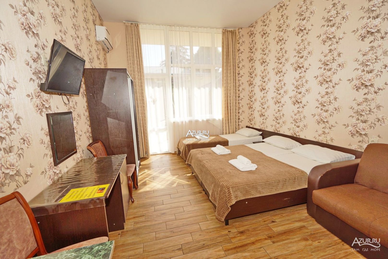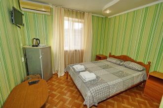 В гостевом доме имеются номера на 2-5 человек и "Делюкс" с личной кухней. Оснащение номеров: душ, туалет, холодильник, телевизор, кондиционер, фен, чайник с посудой, необходимая мебель, полотенце, постельное белье, гигиенические наборы.