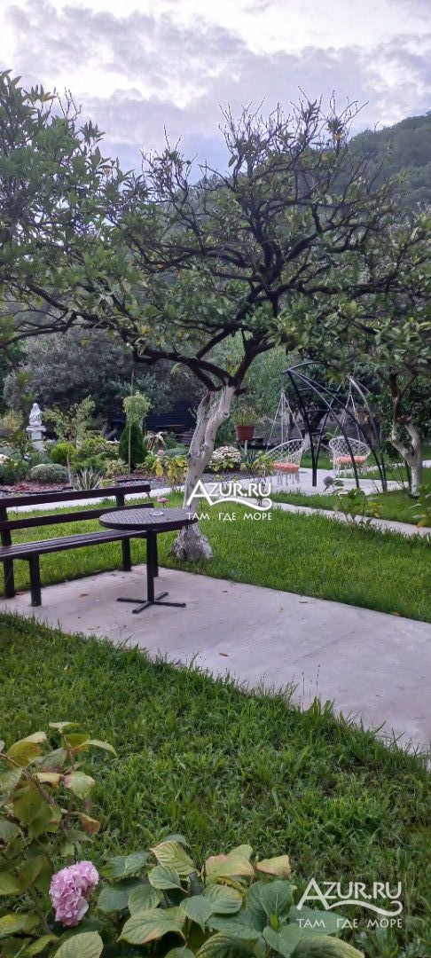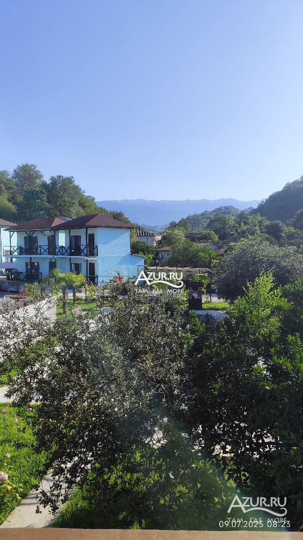 Я очень рада,что знакомство с Абхазией началось именно с этого отеля. Впечатления как при заезде так и при выезде из этого отеля остались очень теплыми и приятными. В этом отеле есть все для душевного, комфортного и красивого отдыха. Наш номер был на втором этаже с видом на великолепные горы и на ухоженный мандариновый сад. В номере как в 5 звездночном отеле есть все: тв, кондиционер, мини холодильник, фен, утюг, гладильная доска, мыло, двухместная кровать, кресло-раскладушка, 2 прикроватные тумбочки, душ, туалет и даже тапочки.На балконе для каждого номера стоят отдельный столик с плетеными креслами. Можно уютненько просидеть. На 1ом этаже здания есть отдельная столовая- кухня, где гости сами могут приготовить себе еду. Посуда и кухонная мебель держится в чистоте и порядке. Готовить там одно удовольствие. Так как все чисто и нет чувства брезгливости. Также в кухне-столовой дополнительно стоят 2 больших холодильника, поэтому все продукты можно оставлять тут и не заморачиваться носить их из номера. Посуда вся новая, красивая- видно, что специально куплена для отдыхающих, а не свои старые использованные. Также понравился ухоженный сад с цветами и мандаринами, своей зоной барбекю и плетеными 3 качелями. Вечерами очень нравилось проводить там время. Также есть зона кафе, где вечером хозяева сами готовили по меню вкусные блюда на заказ. Меню разнообразное вкусное и цены приемлемые. Вокруг много красивых отелей, но они все такие холодные и без ухоженного сада. Расположение к морю тоже очень удобное, так как это местоположение находится в середине пляжного побережья. Если уйти правее, то будет сосновый пляж, если левее, то песчаный. Поэтому можно отдыхать везде, добираться очень удобно, 5-7 минут пешим шагом. Как то так...для любителей душевного, тихого, семейного отдыха будет отличное место. Советую. Рядом тихо, шума никакого нет, спиться спокойно. Минусов не увидела. Персонал дружелюбный, любящий свое дело.