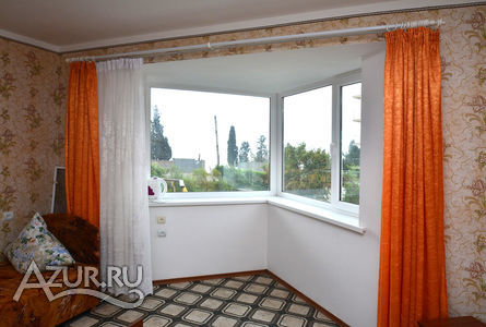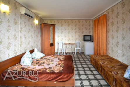 из панорамного окна красивый вид на горы и море. На этаже общий на четыре номера умывальник и туалет. И комната отдыха с видовым окном, столом и стульями. Две душевых и кухня на первом этаже. В каждом номере допустимы до двух дополнительных спальных мест (еврораскладушки - 300 руб/чел.)